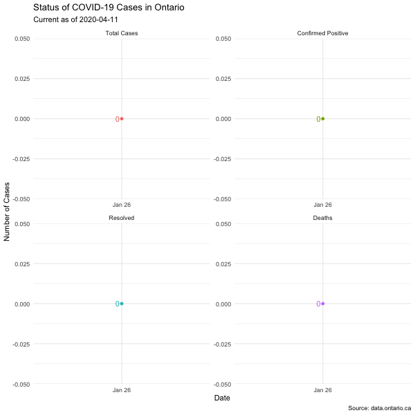 The Data User Group continues to track and analyze the growth of the pandemic in Ontario. The following animated visualization designed by @GregRousell depicts the increase in Total Cases, Confirmed Cases, Resolved Cases and Deaths in Ontario: